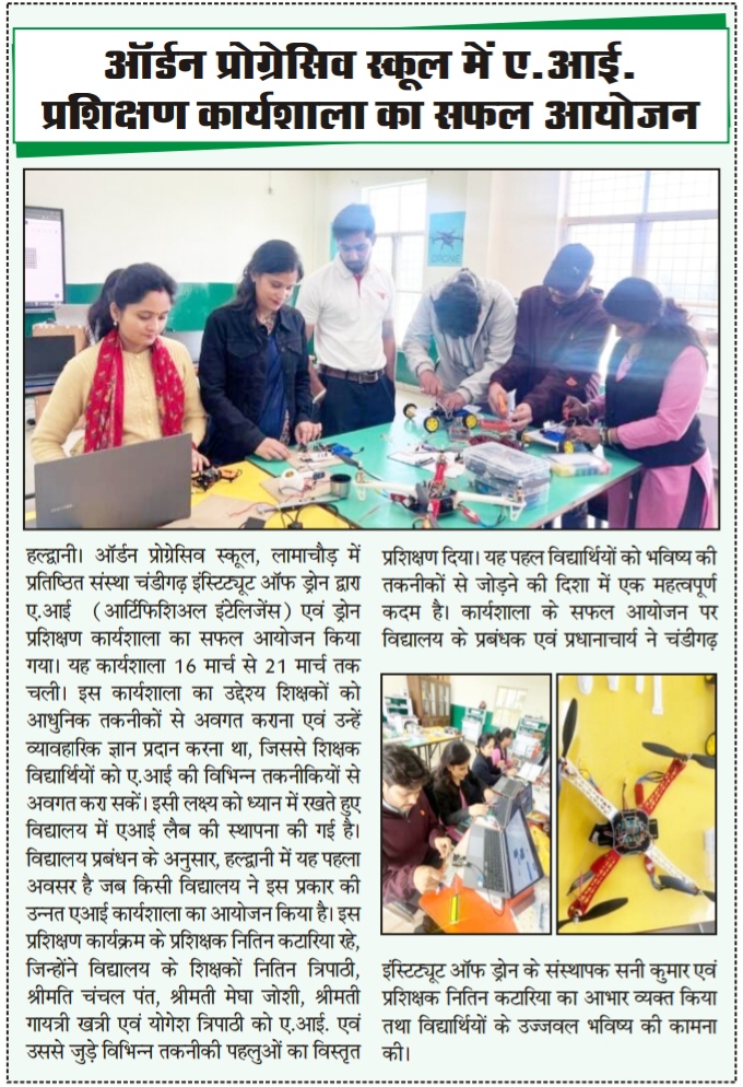 हल्द्वानी । ऑर्डन प्रोग्रेसिव स्कूल, लामाचौड़ में प्रतिष्ठित संस्था चंडीगढ़ इंस्टिट्यूट ऑफ ड्रोन द्वारा ए.आई एवं ड्रोन प्रशिक्षण कार्यशाला का सफल आयोजन किया गया। यह कार्यशाला दिनांक 16/03/2026 से दिनांक 21/03/2026 तक चली। इस कार्यशाला का उद्देश्य शिक्षकों को आधुनिक तकनीकों से अवगत कराना एवं उन्हें व्यावहारिक ज्ञान प्रदान करना था, जिससे शिक्षक विद्यार्थियों को  ए.आई की विभिन्न तकनीकियों से अवगत करा सकें। इसी लक्ष्य को ध्यान में रखते हुए विद्यालय में ए.आई लैब की स्थापना की गई है। विद्यालय प्रबंधन के अनुसार, हल्द्वानी में यह पहला अवसर है जब किसी विद्यालय ने इस प्रकार की उन्नत ए.आई कार्यशाला का आयोजन किया है। इस प्रशिक्षण कार्यक्रम के प्रशिक्षक नितिन कटारिया रहे, जिन्होंने विद्यालय के शिक्षकों नितिन त्रिपाठी, श्रीमति चंचल पंत, श्रीमती मेघा जोशी, श्रीमती गायत्री खत्री एवं योगेश त्रिपाठी को ए.आई. एवं उससे जुड़े विभिन्न तकनीकी पहलुओं का विस्तृत प्रशिक्षण दिया। यह पहल विद्यार्थियों को भविष्य की तकनीकों से जोड़ने की दिशा में एक महत्वपूर्ण कदम है। कार्यशाला के सफल आयोजन पर विद्यालय के प्रबंधक एवं प्रधानाचार्य ने चंडीगढ़ इंस्टिट्यूट ऑफ ड्रोन के संस्थापक सनी कुमार एवं प्रशिक्षक नितिन कटारिया का आभार व्यक्त किया तथा विद्यार्थियों के उज्जवल भविष्य की कामना की।
