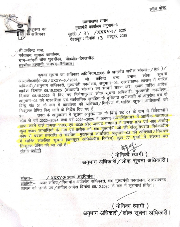 हल्द्वानी। उत्तराखंड में मुख्यमंत्री विवेकाधीन राहत कोष जो आपदा, बीमारी और आकस्मिक संकट से जूझ रहे जरूरतमंदों के लिए अंतिम सहारा माना जाता है, अब गहरे सवालों के घेरे में है। किसान मंच उत्तराखंड ने सूचना अधिकार अधिनियम (RTI) के तहत प्राप्त दस्तावेजों के आधार पर आरोप लगाया है कि मुख्यमंत्री की कर्मभूमि चंपावत और जन्मभूमि उधम सिंह नगर में ही इस कोष से बड़े पैमाने पर धनराशि का वितरण हुआ, जिसमें पारदर्शिता, पात्रता और निष्पक्षता को लेकर गंभीर शंकाएं पैदा होती हैं। संगठन ने इसे “विवेकाधीन नहीं, संपर्काधीन व्यवस्था” बताते हुए श्वेत पत्र और स्वतंत्र जांच की मांग की है।